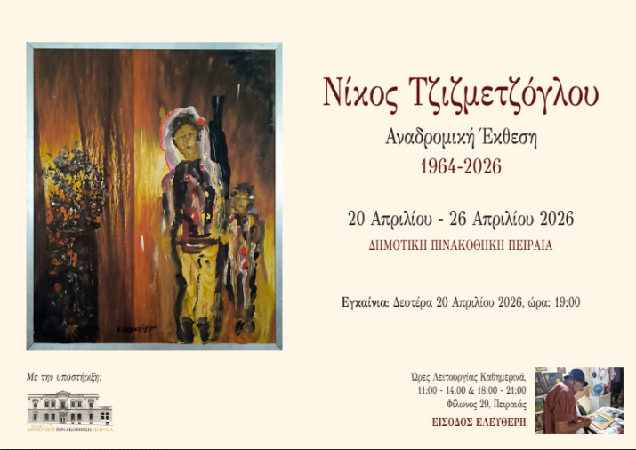 Η Δημοτική Πινακοθήκη Πειραιά φιλοξενεί την έκθεση ζωγραφικής του καταξιωμένου δημιουργού Νίκου Τζιζμετζόγλου, προσκαλώντας το κοινό σε ένα ιδιαίτερο εικαστικό ταξίδι γεμάτο χρώμα, υφή και προσωπική έκφραση. Τα εγκαίνια της έκθεσης θα πραγματοποιηθούν τη Δευτέρα 20 Απριλίου 2026 και ώρα 19:00, σηματοδοτώντας την έναρξη μιας ξεχωριστής καλλιτεχνικής παρουσίασης.